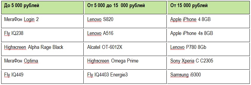 Рейтинг топ-5 самых популярных мобильных телефонов в разных ценовых категориях по итогам продаж в сети собственного ритейла в первом полугодии 2014 года: