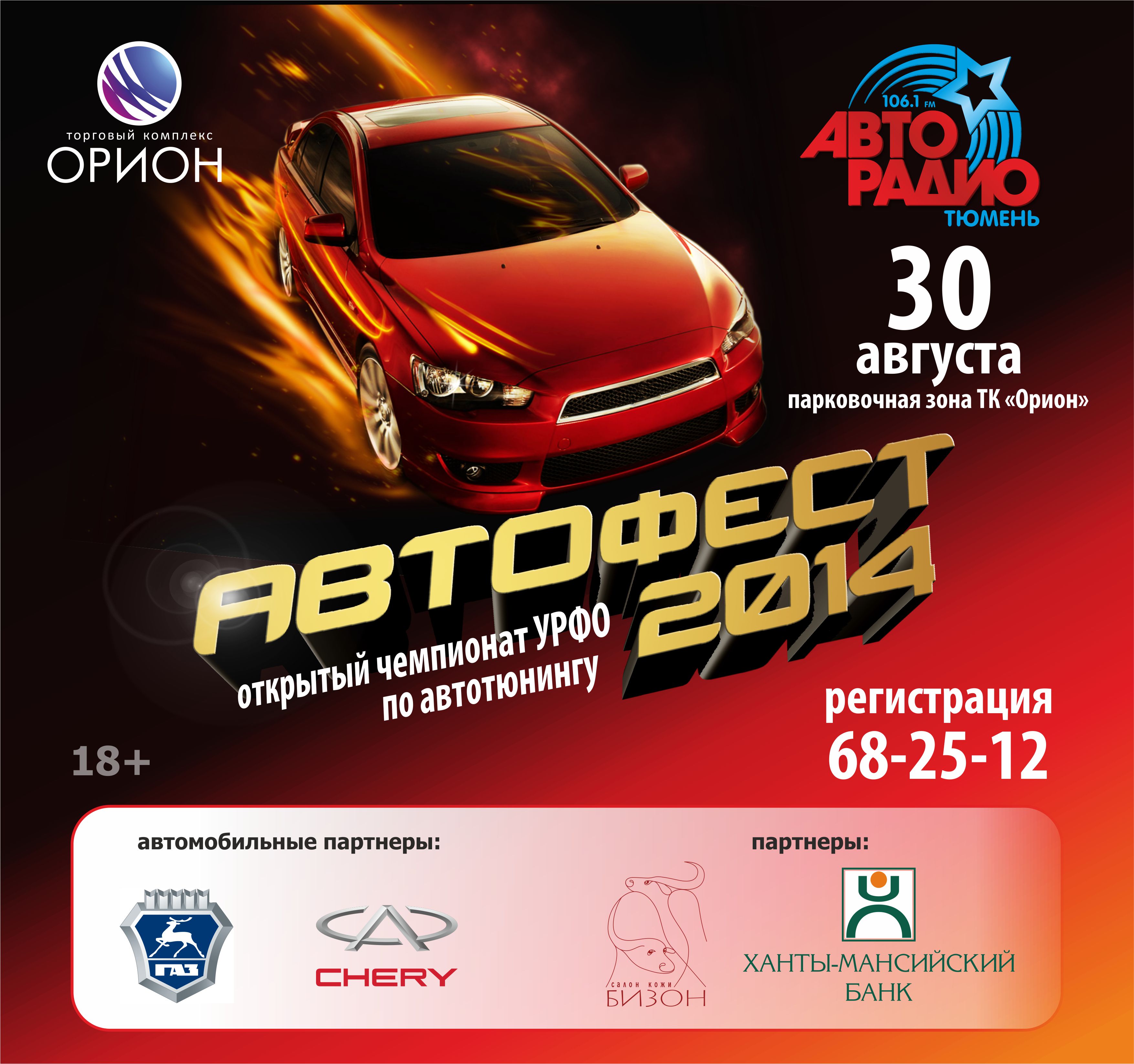 «Авторадио» представляет открытый чемпионат по автотюнингу «Автофест-2014», который состоится в Тюмени 30 августа на парковочной зоне торгового комплекса «Орион» (по ул. Федюнинского). Каждый автолюбитель сможет выступить на мероприятии и побороться за призы от организаторов. Также зрителей ждет презентация «Автомобиля года», шоу экскаваторов JCB, выступление дрифтеров, стантрайдеров и многое другое.