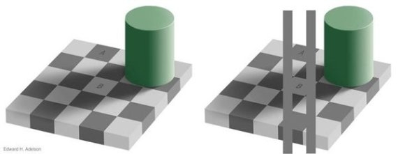 Восприятие субъективно. Точка. Чтобы лучше понять этот тезис, посмотрите на рисунок ниже: клетки, маркированные буквами A и B — абсолютно одинакового цвета (если вас не убеждает правая часть рисунка, вы можете проверить это с помощью пипетки из Фотошопа, или же распечатать рисунок, вырезать квадраты, и положить их рядом друг с другом). Очевидно, что все люди, которым вы покажете этот рисунок, будут убеждены, что клетки А и В разного цвета, хотя фактически это не так. И люди поверят своим глазам, а не вашим объяснениям.