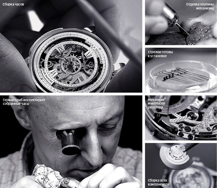 Основа второй коллекции Grieb & Benzinger, которая называется «Бутик» (Boutique), – швейцарские механизмы с ручным заводом ETA-Unitas 6497/6498, доведенные до уровня шедевра высокого часового искусства. И здесь немалую роль играет вторая специализация марки – искусство изготовления гравированных скелетонизированных механизмов. Все работы проводятся вручную, по старинке: для того чтобы убрать из платины или моста механизма лишний металл, применяется ювелирный лобзик. По-другому нельзя, так как предварительно эти детали украшаются гравированным узором, как правило, растительным орнаментом. То, как пойдет резец мастера, нанося прихотливые изгибы орнамента, предсказать невозможно, и потому даже в качестве предварительной операции обработка деталей на станке с ЧПУ не имеет смысла. Да и в Grieb & Benzinger таких станков за ненадобностью нет.