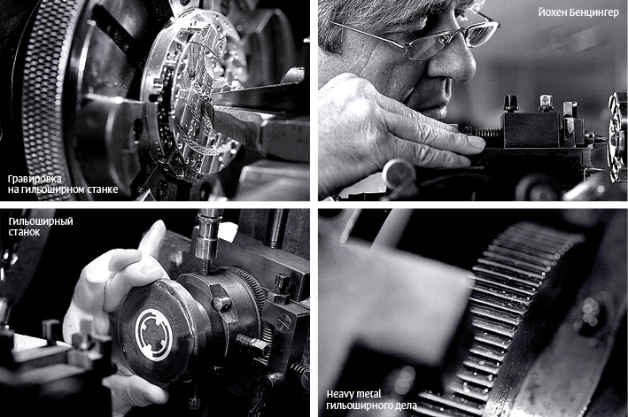Далеко не все современные часовые марки могут позволить себе роскошь уделять основное внимание тонкой ручной отделке часов и механизмов. Серьезных профессионалов в этом трудном ремесле и того меньше, в особенности тех часовых фирм, что посвятили себя этому полностью. Именно такую специализацию выбрала для себя немецкая часовая марка Grieb & Benzinger, что, впрочем, неудивительно, если вспомнить тот факт, что Йохен Бенцингер, один из ее учредителей, считается главным специалистом в Германии по гильоше, гравировке и скелетонизированию механизмов и одним из лучших в мире. Гильоше – традиционный способ отделки корпусов карманных часов и циферблатов, который производится на уникальных гильоширных станках, чем-то напоминающих, на первый взгляд, станки токарные – по меньшей мере габаритами. Гильоширный станок только называется станком: вся работа фактически выполняется вручную. К закрепленной на вращаемом вручную шпинделе детали так же вручную, с точно выверенным усилием подводится остро заточенный резец, оставляющий на ней концентрические, продольные и волнистые штрихи. Особую привлекательность гильоширной технике придает возможность применения в отделке одной детали множества типов гильоше – чаще всего этот прием используется при отделке циферблатов, что позволяет добиться потрясающего результата.