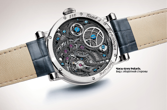 В модели Grey Polaris на первый план выходит искусство гильоширной обработки – с лицевой стороны часов мы видим украшенные узором гильоше ободок, составленный из двух деталей циферблат и открытые со стороны циферблата детали механизма, а на оборотной стороне сквозь прозрачное окно задней крышки корпуса заметен частично скелетонизированный механизм, детали которого украшены гильоше различных типов. Возможно, это наиболее сложные с точки зрения использования техники гильоше наручные часы в мире.